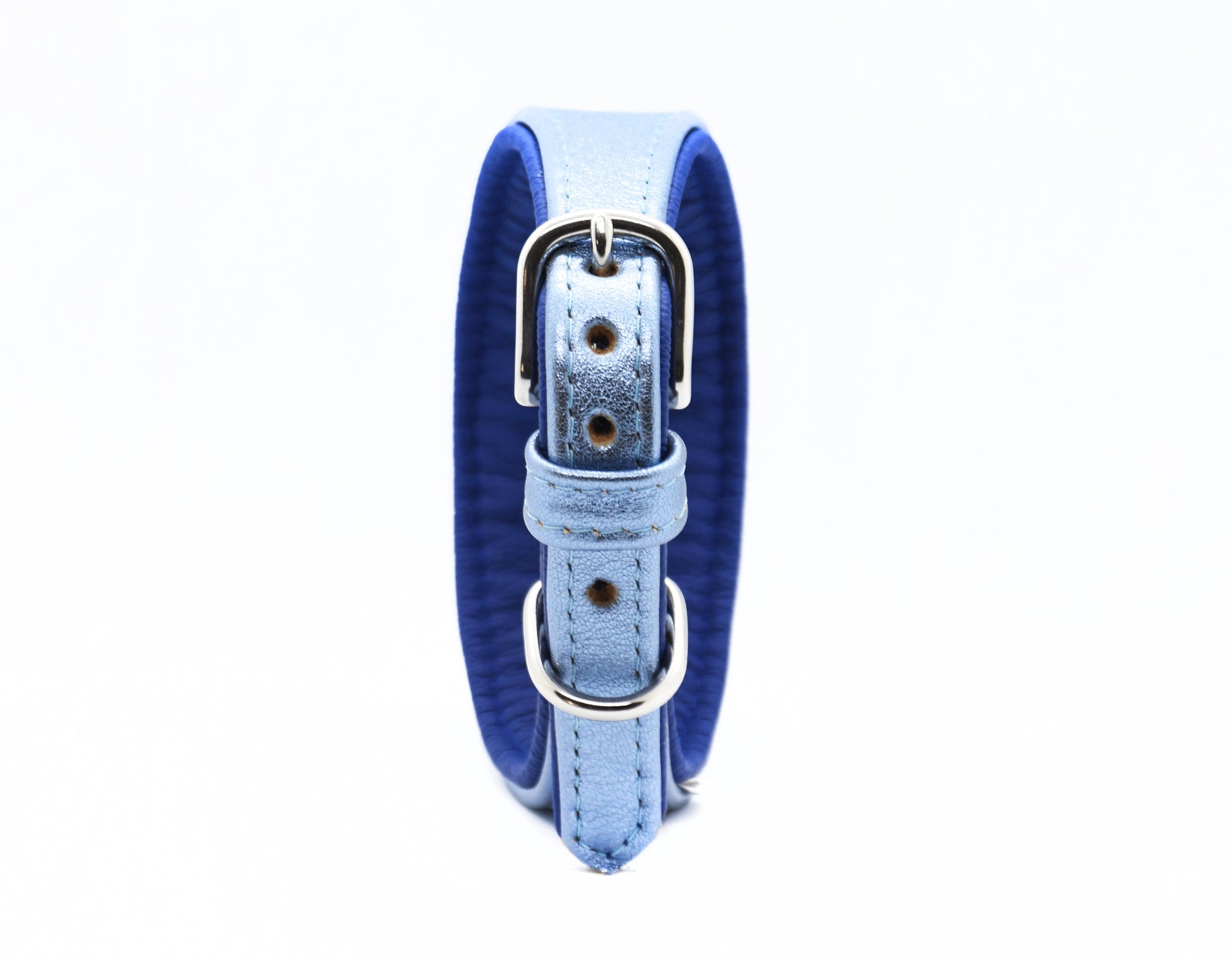 Das CELESTE Windhundhalsband ist ein wahres Meisterwerk der Handwerkskunst! Hergestellt aus samtweichem, italienischen Ziegenleder aus der Region Porto Sant'Elpidio, schimmert dieses Halsband im silbrig-blauen Metallic-Look, der in der Sonne eine einzigartige Optik entfaltet. Dieses edle Windhundhalsband Leder ist perfekt für besondere Anlässe, bei denen dein Hund glänzen soll! Das Ziegenleder wird mit butterweichem Leder unterfüttert, um deinem Hund maximalen Komfort zu bieten.