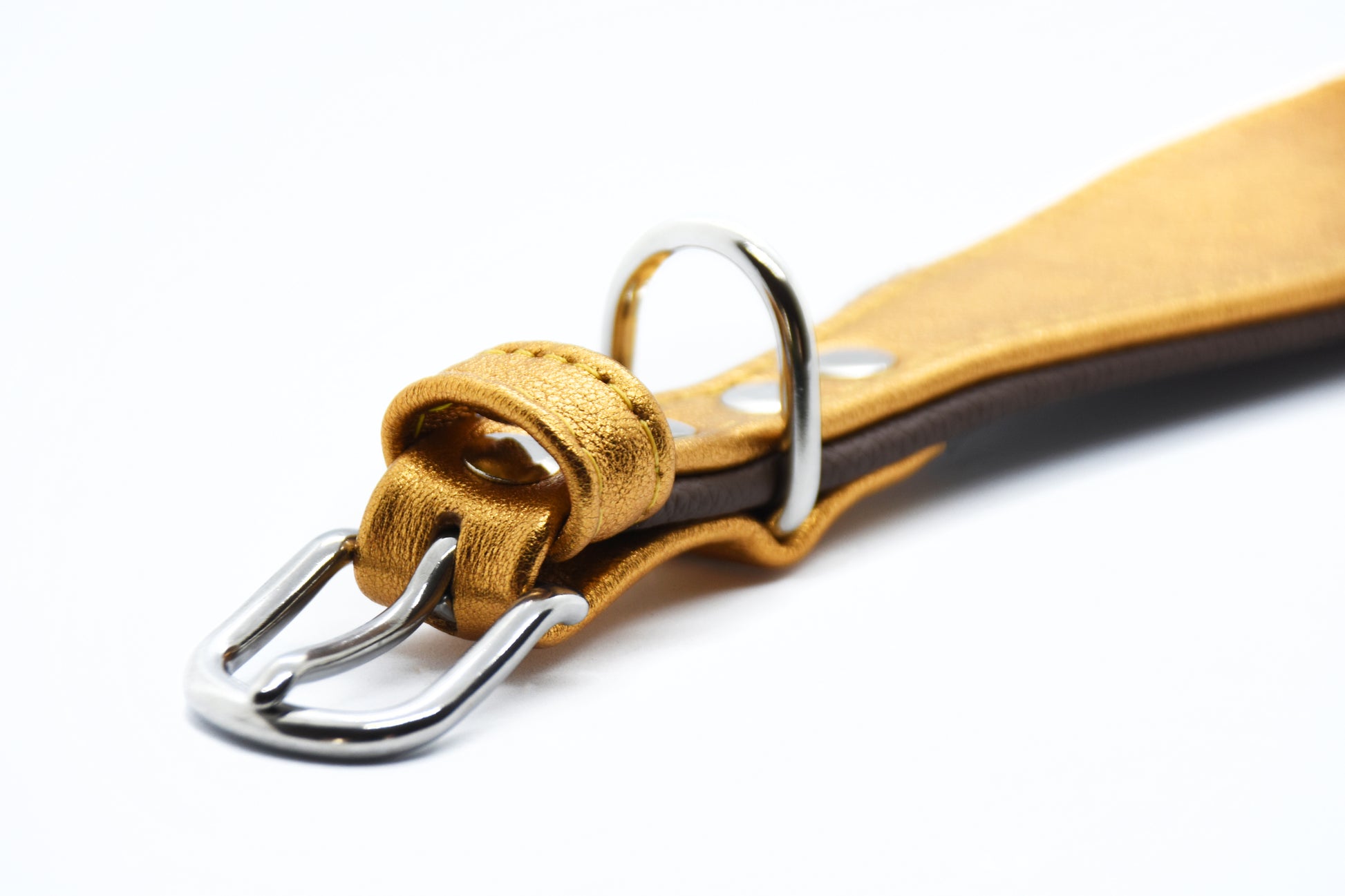 Das GOLD Windhundhalsband ist ein wahres Meisterwerk der Handwerkskunst! Hergestellt aus samtweichem, italienischen Ziegenleder aus der Region Porto Sant'Elpidio, schimmert dieses Halsband im Metallic-Look, der in der Sonne eine einzigartige Optik entfaltet. Dieses edle Windhundhalsband Leder ist perfekt für besondere Anlässe, bei denen dein Hund glänzen soll! Das Ziegenleder wird mit butterweichem Leder unterfüttert, um deinem Hund maximalen Komfort zu bieten.