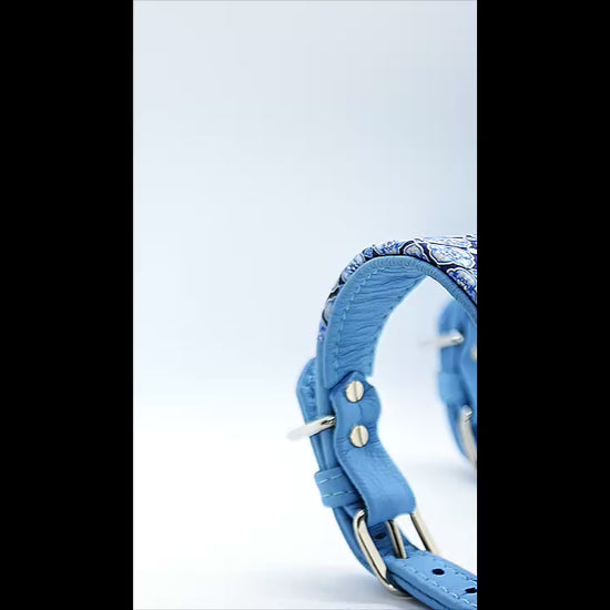 Das Modell "Fiore" wird aus butterweichem, hellblauen Nappaleder gefertigt und mit einem Designerstoff veredelt. Das Halsband wird leicht gepolstert, die Beschläge bestehen aus hochwertigem, bruchfesten und rostfreiem Edelstahl.