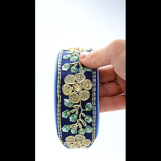 Unsere Frühjahr/Sommer Kollektion 2025! Unser Sari darkblue Halsband kombiniert die Eleganz indischer Sari Borten mit der klassischen Schönheit eines gepolsterten Lederhalsbands. Feine, handgefertigte Stickereien verleihen dem Halsband einen einzigartigen, indischen Stil, der deinem Windhund einen luxuriösen und gleichzeitig stilvollen Look verleiht. Ideal für besondere Anlässe, ist dieses Halsband die perfekte Wahl für Windhundbesitzer, die ihren Hund mit einem Hauch von Eleganz ausstatten möchten.